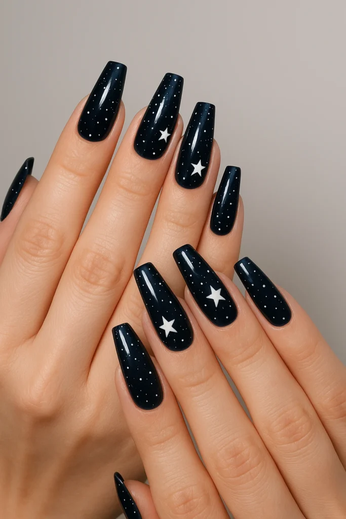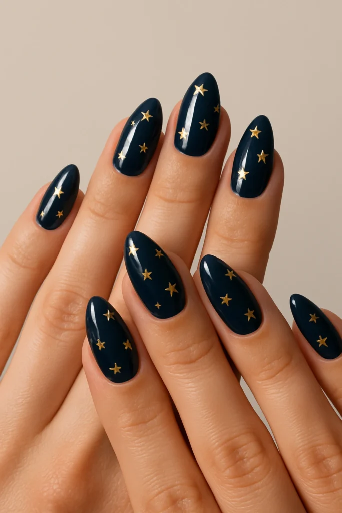 Dark navy nails accented with small gold stars create a minimalist yet striking winter-inspired manicure. Subtle and sophisticated for all-year wear.