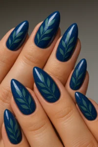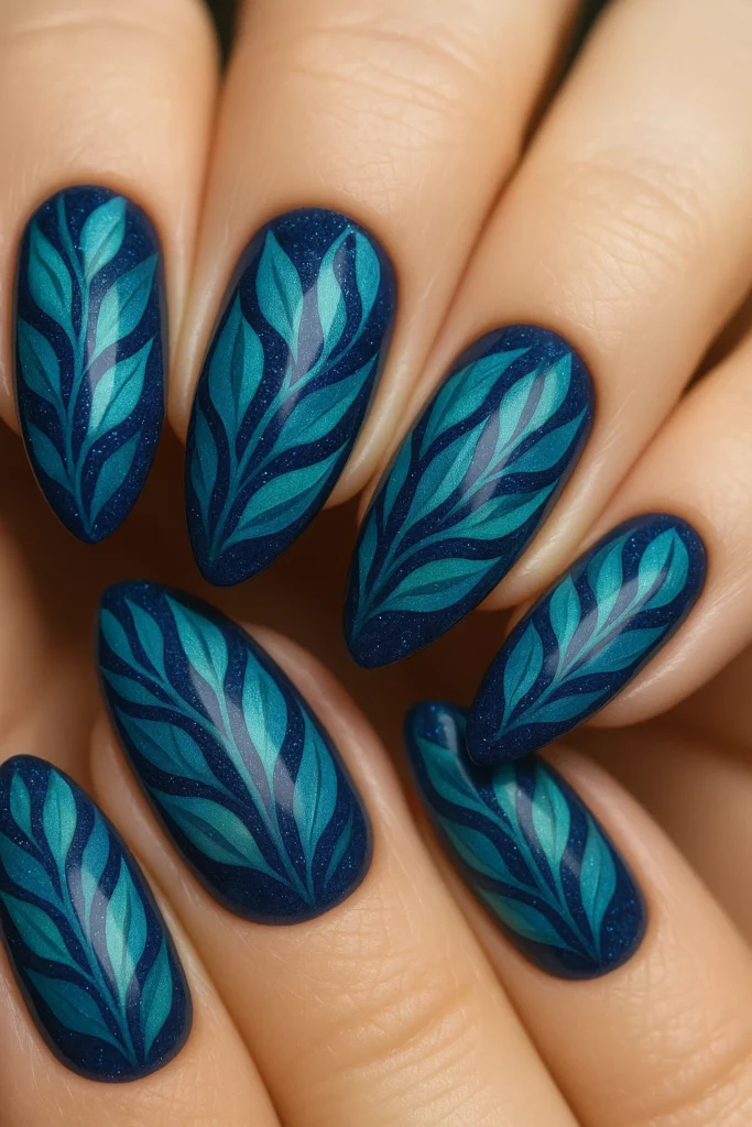 Deep blue almond nails are adorned with abstract leaf motifs in green-blue tones, accented with subtle shimmer. This chic winter manicure blends natural inspiration with a modern edge, perfect for daytime or evening looks.