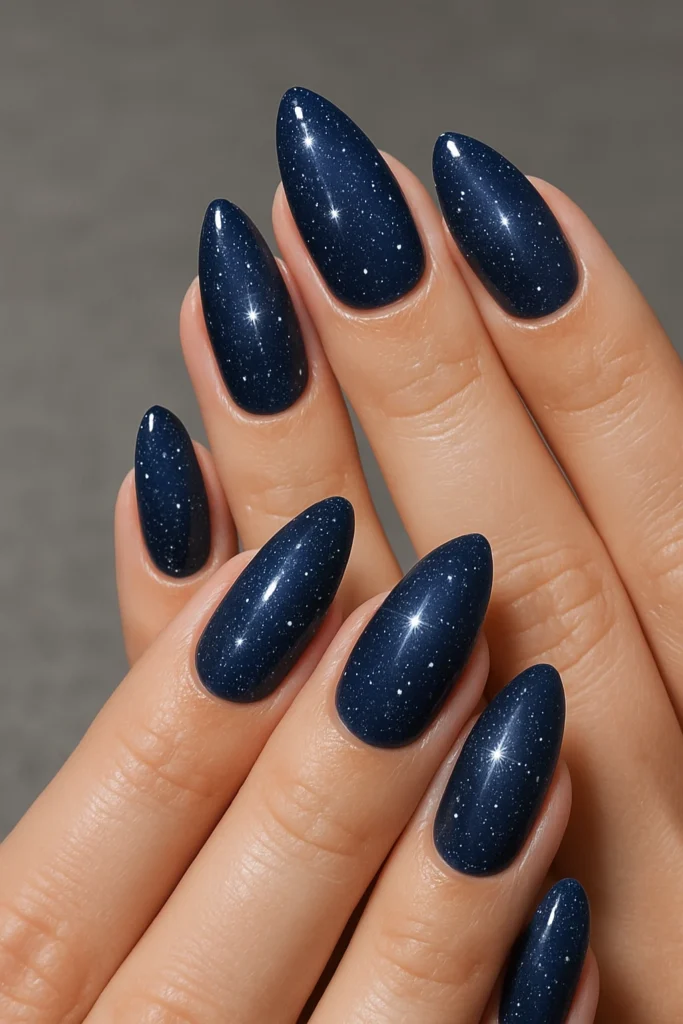 Deep navy almond nails accented with twinkling white star-like shimmer and subtle frosty highlights evoke a magical winter night. Perfect for formal occasions or a chic everyday statement, these nails balance elegance and seasonal inspiration beautifully.