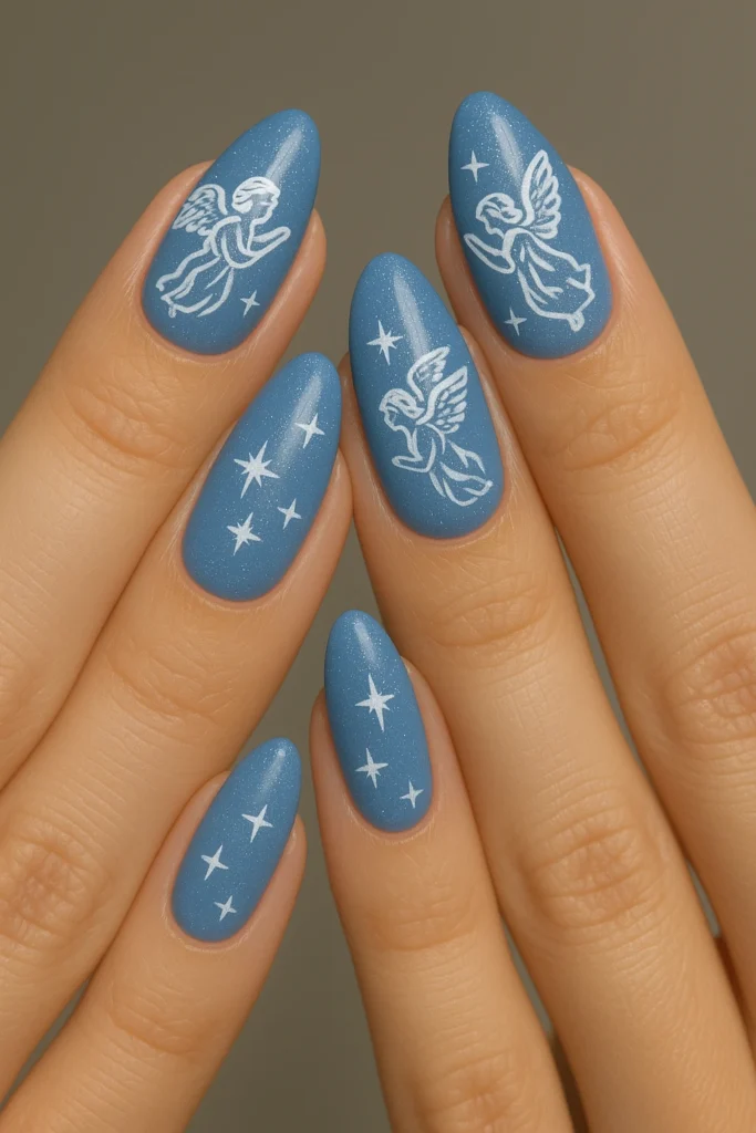 Medium blue almond nails are adorned with abstract angel and star motifs, accented with fine silver shimmer. This playful and magical design balances whimsy and elegance, perfect for year-round style.