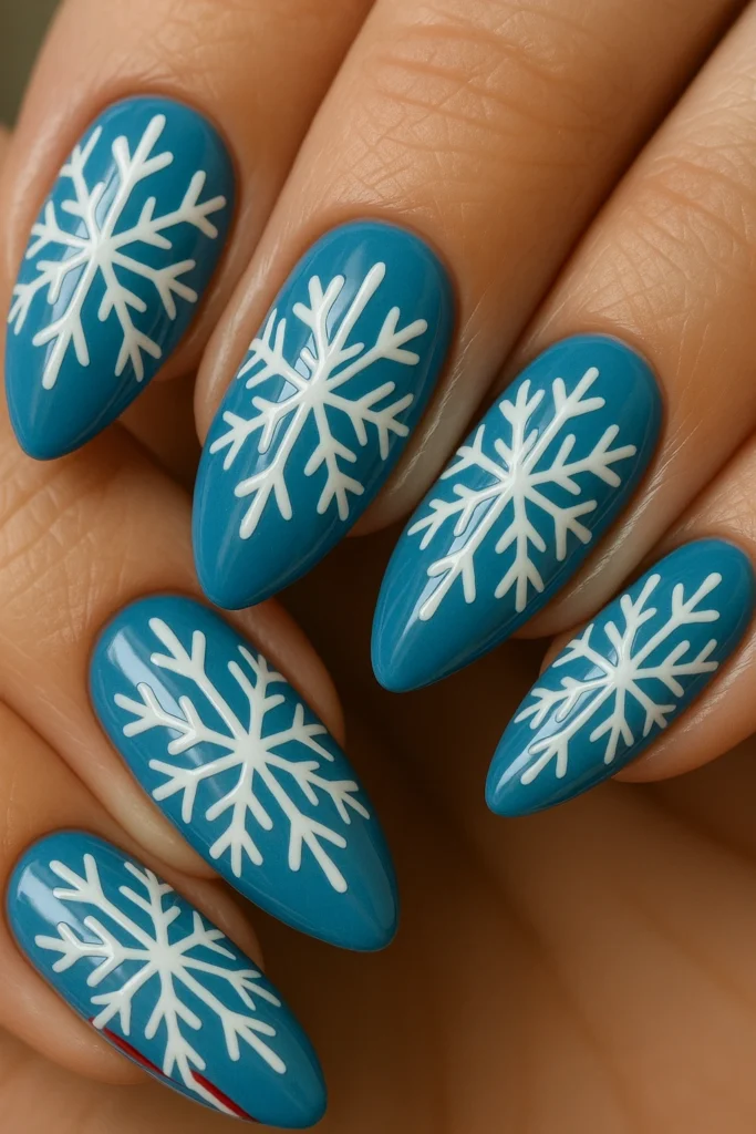 Medium blue nails feature abstract snowflake motifs and subtle red-white stripes for a playful touch. Festive yet understated, this design works for winter styling all year long.