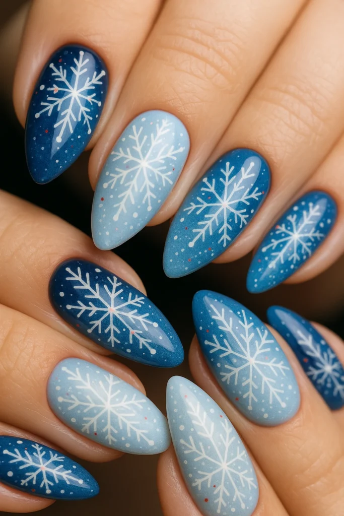 Multi-shaded blue nails adorned with abstract snowflakes and tiny festive accents combine elegance with playfulness. Perfect for winter styling that can last year-round.