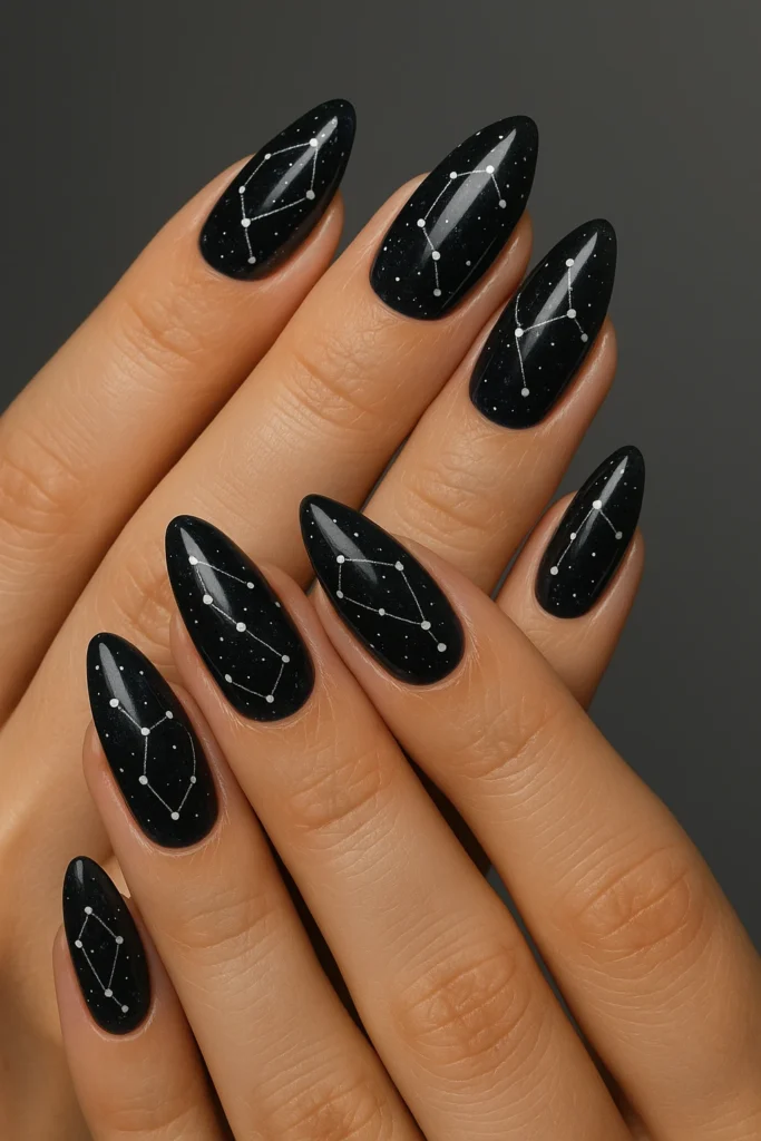 Dark nails with constellation-inspired designs offer a celestial, elegant winter manicure. Subtle and versatile, suitable for year-round wear.