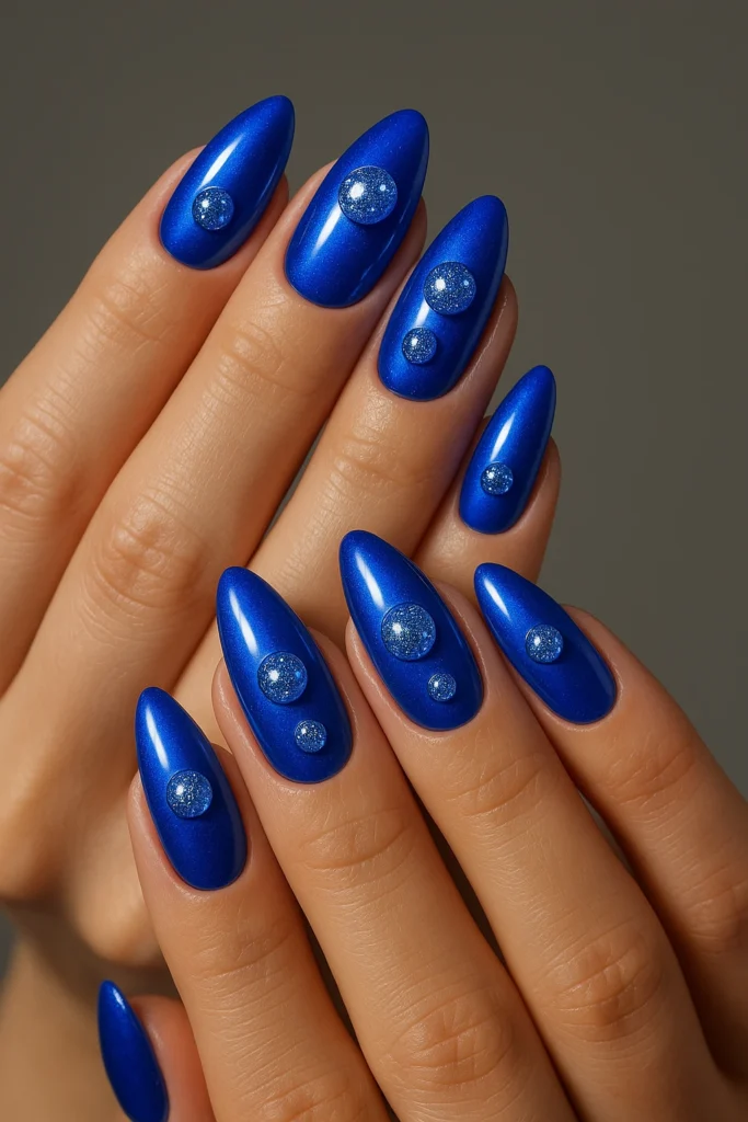 Vibrant cobalt blue almond nails sparkle with orb-like glitter accents and subtle metallic shimmer, offering a playful yet refined design. Ideal for winter parties or adding a pop of glamour to everyday outfits, these nails balance color, texture, and shine effortlessly.