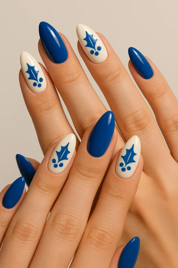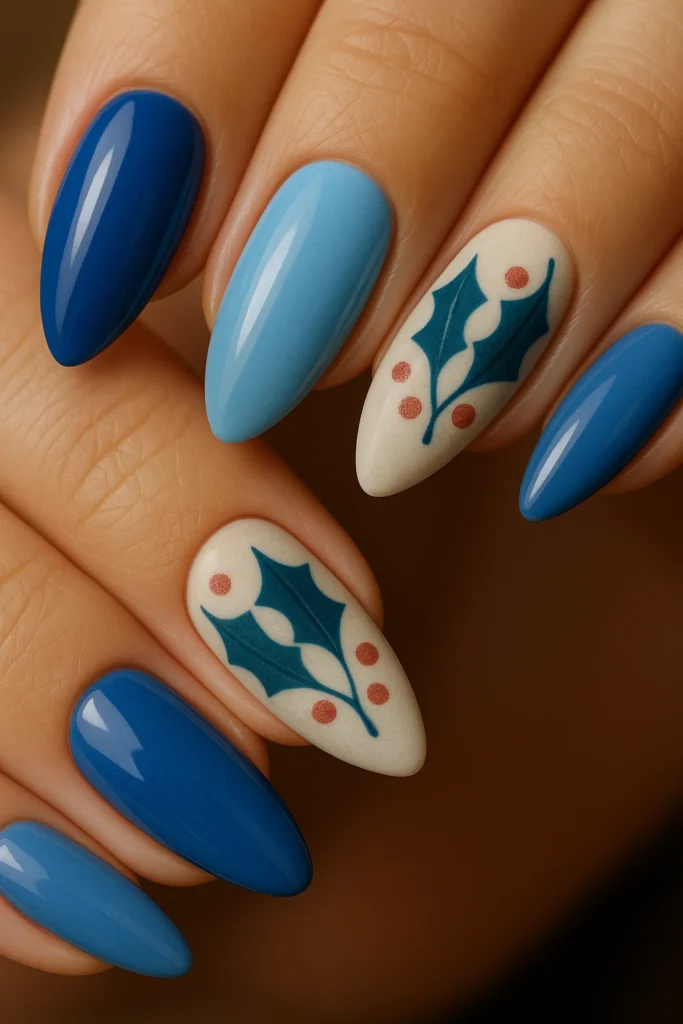 Blue and cream nails feature abstract holly-inspired accents, offering a sophisticated seasonal design without overt holiday imagery. Elegant and versatile for year-round wear.
