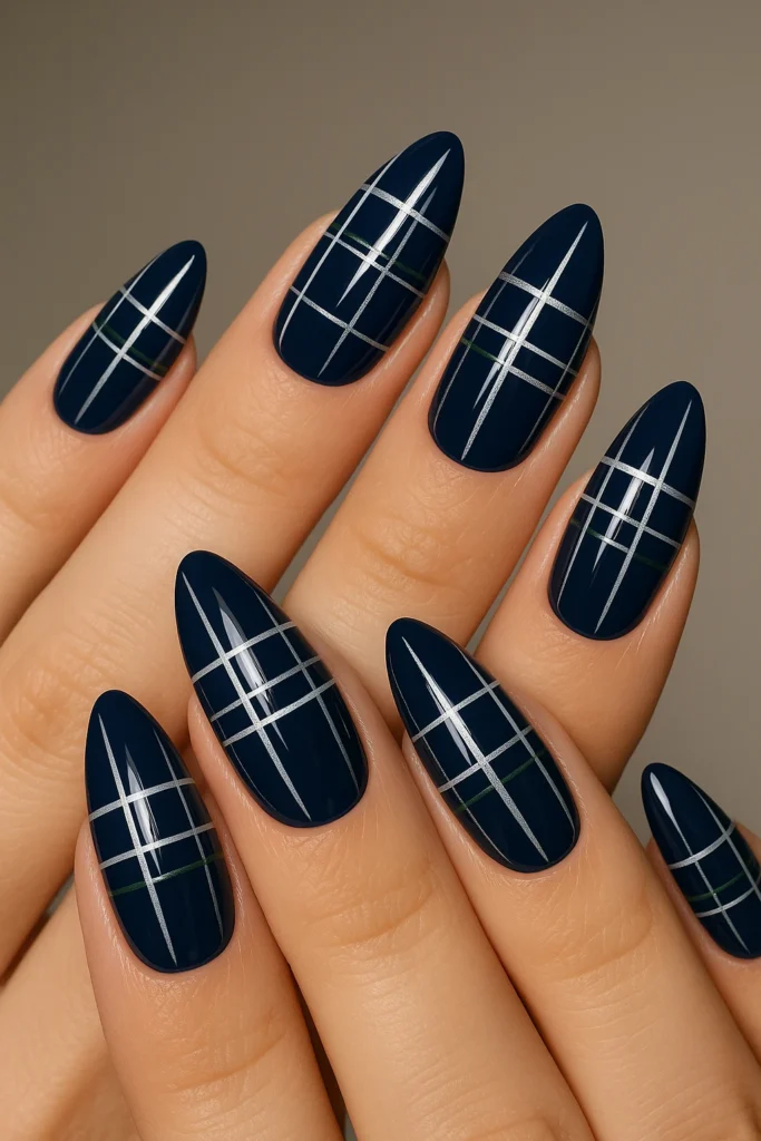 Deep navy nails with moody tartan plaid patterns offer a stylish, winter-appropriate look. Sophisticated and modern, perfect for bold nail statements.