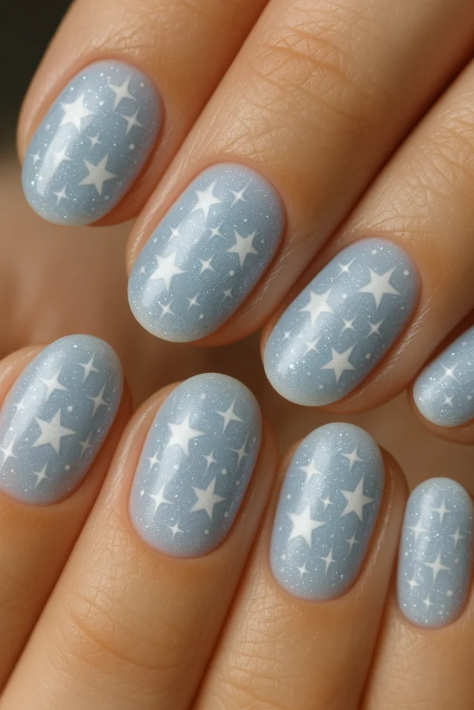 Soft baby blue nails evoke a serene winter sky, adorned with tiny white stars and subtle frosty shimmer. This whimsical yet refined design is perfect for those who want a winter-inspired look without overt holiday motifs. Elegant and versatile, these nails suit casual days or cozy evenings out.
