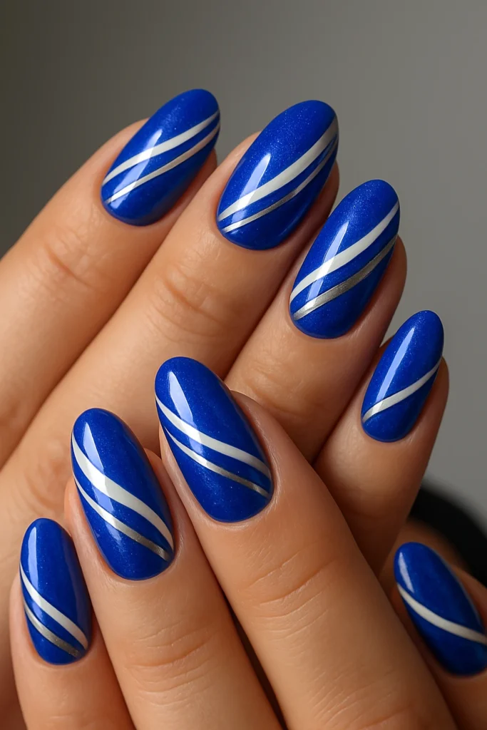 Cobalt blue nails with white and metallic stripes create a playful, candy-inspired design without being overtly festive. Subtle shimmer adds sophistication, making these nails suitable for stylish winter looks or year-round wear.
