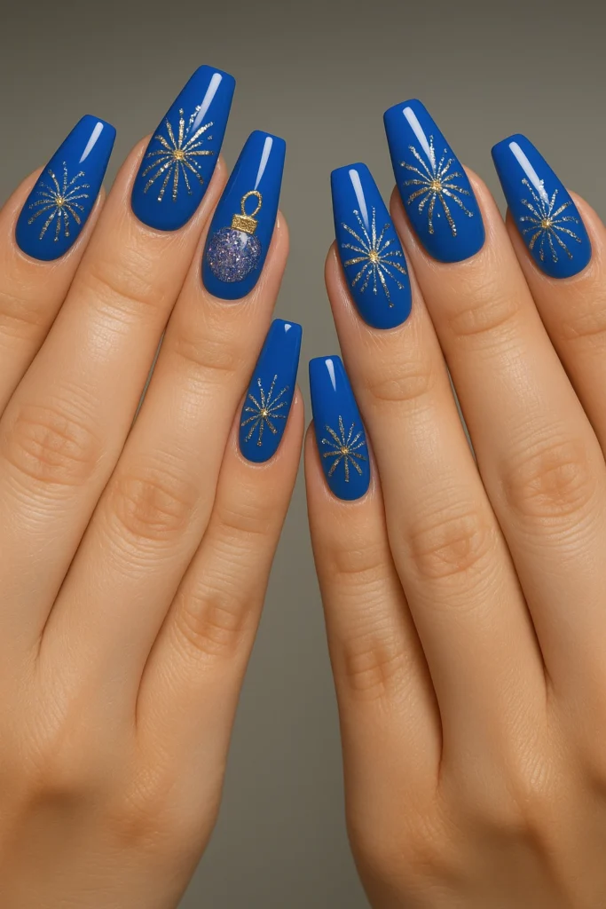 Blue nails with abstract bauble and fireworks motifs provide playful sparkle and subtle festive inspiration. Stylish and versatile for year-round wear.