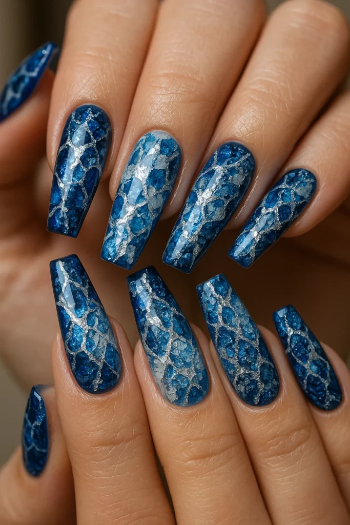 Layered blue and white nails mimic ice crystal or geode textures, creating an elegant, wintry statement. Perfect for bold and artistic nail enthusiasts.