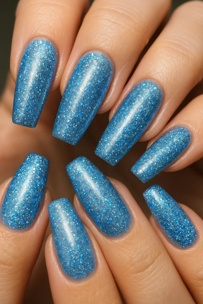 Medium blue coffin nails layered with silver and blue glitter evoke the icy magic of winter. The multi-dimensional shimmer creates eye-catching sparkle perfect for parties, nights out, or stylish daywear.