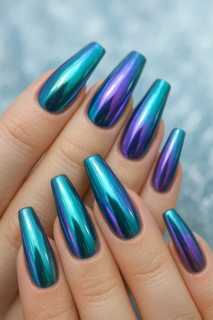 Coffin-shaped nails with iridescent chrome powder shift from blue to green and purple, creating an aurora-inspired look. Fashion-forward and ethereal, these nails are perfect for making a statement in winter or beyond.