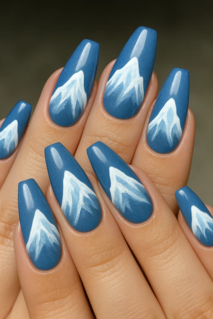 Medium blue coffin nails showcase abstract mountain peaks accented with subtle shimmer and soft gradient highlights, evoking a serene winter landscape. Perfect for statement looks that combine bold geometry with delicate sparkle.
