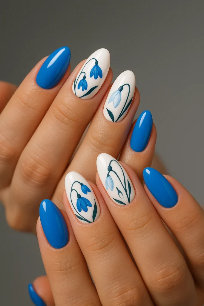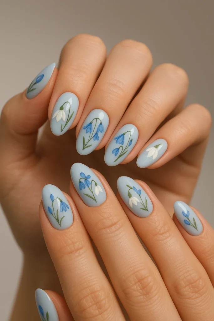 Light blue nails are adorned with delicate floral motifs inspired by snowdrops and blue bells. Elegant and refreshing, this manicure captures subtle winter charm suitable for everyday wear.