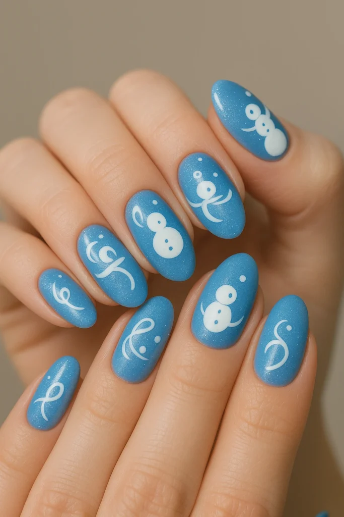Bright blue oval nails feature abstract snow figure-inspired motifs with soft white shimmer, creating a whimsical winter manicure. Fun and playful, these nails convey festive cheer while remaining stylish for year-round wear.