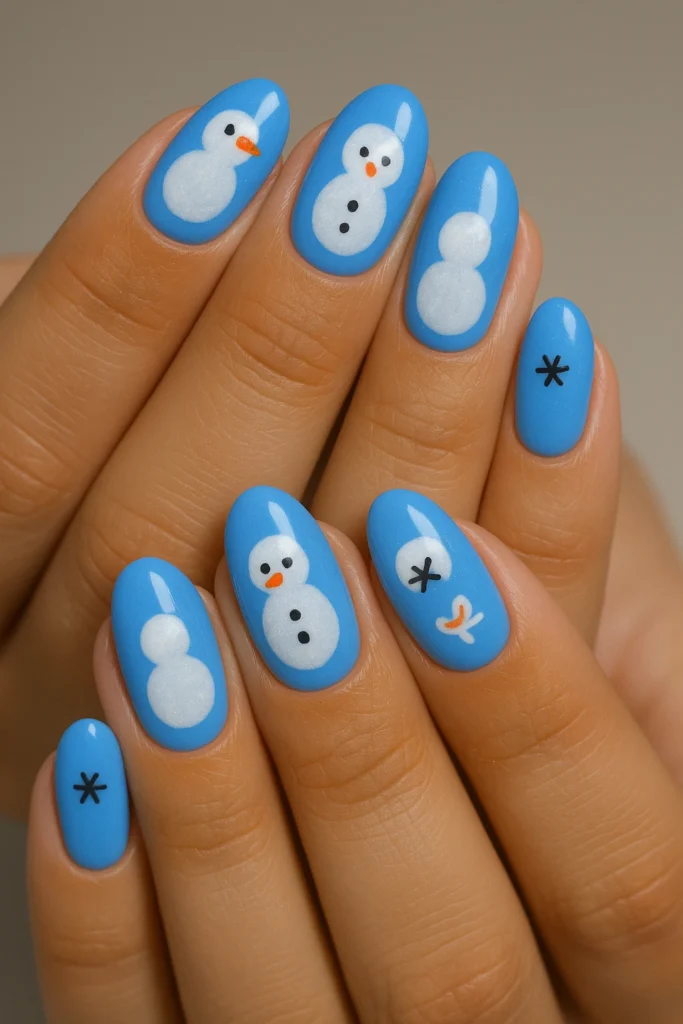 Blue nails with abstract snowman-inspired motifs offer playful winter charm without being too literal. Perfect for a whimsical, stylish manicure year-round.