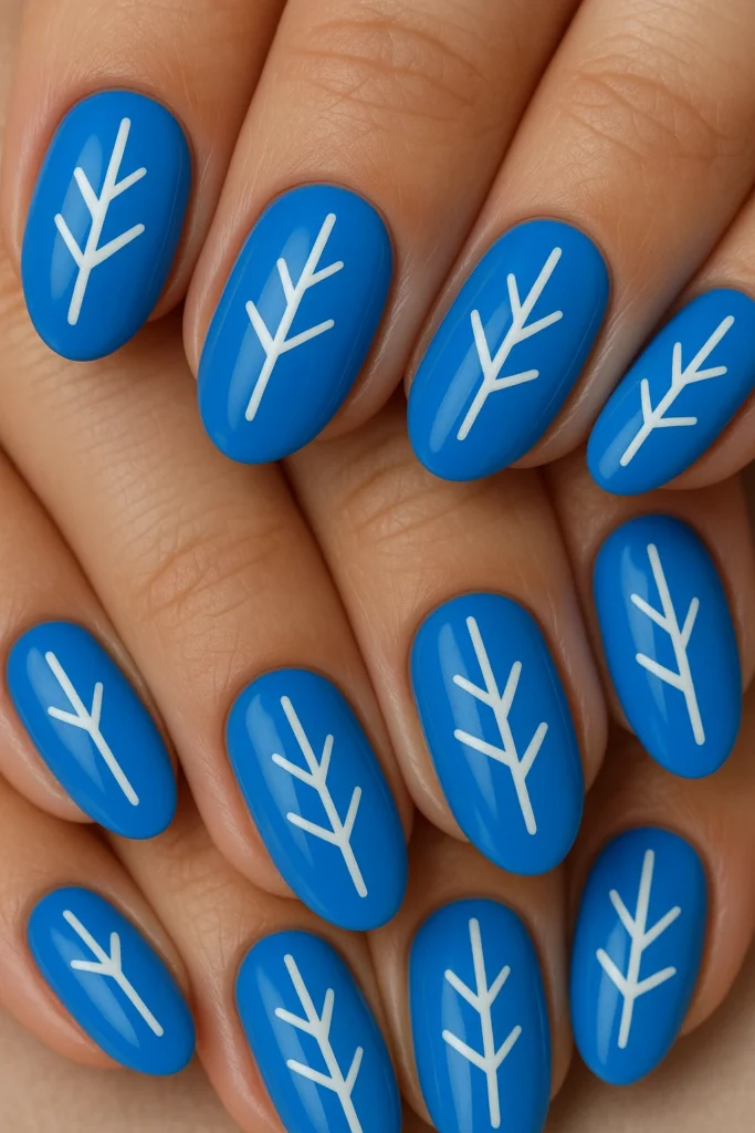 Bright blue nails with minimalist abstract tree motifs provide a modern, chic winter-inspired look. Subtle yet festive without being overly thematic, suitable year-round.