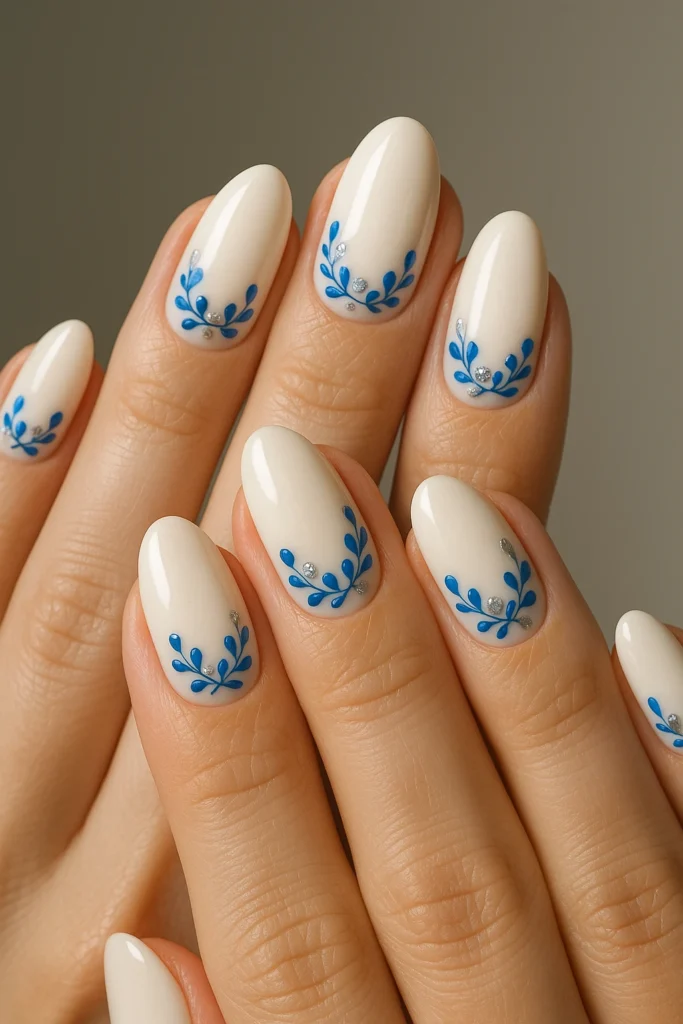 Creamy white nails with abstract blue and silver berry wreath designs offer a unique winter-inspired manicure. Elegant and festive without being overtly holiday-themed.
