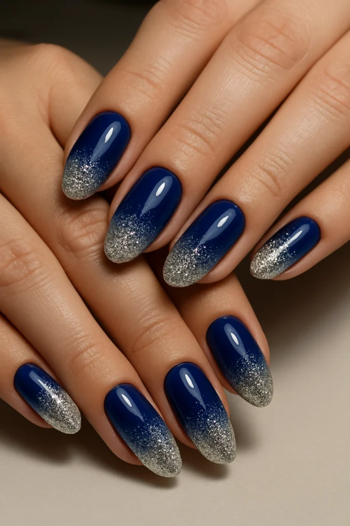 Deep blue oval nails transition seamlessly into silver glitter tips, offering a chic gradient effect. Perfect for winter styling or glamorous occasions, this design captures icy elegance and modern sophistication.