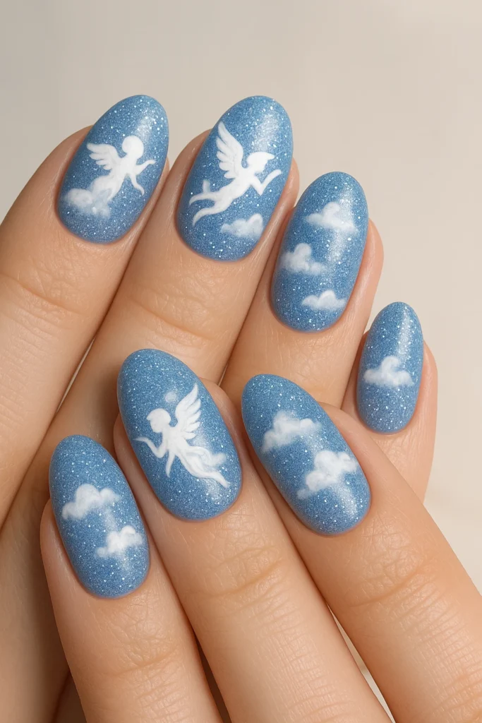 Light blue oval nails sparkle with fine glitter and subtle angelic motif accents paired with soft cloud-like shimmer. Whimsical and delicate, this manicure conveys winter charm and versatile style.