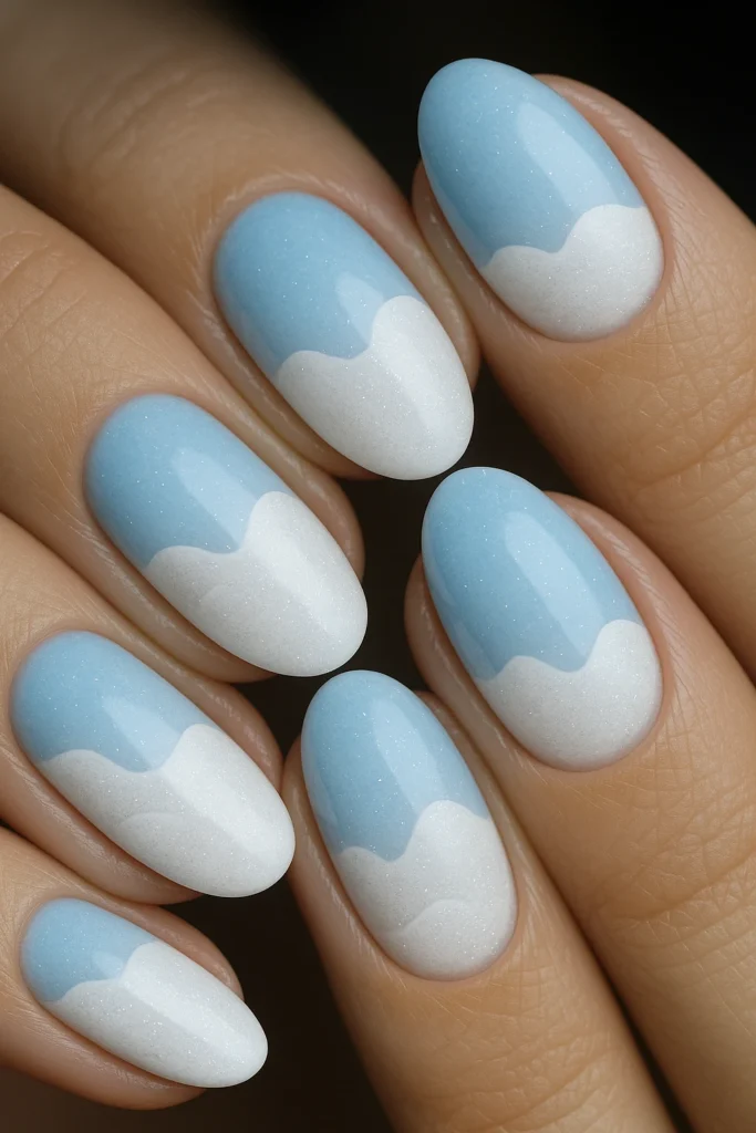 Light blue oval nails feature a soft gradient inspired by frosted winter hills. Abstract snow-like shapes and delicate shimmer give dimension and sophistication, creating an understated yet striking winter manicure perfect for any occasion.