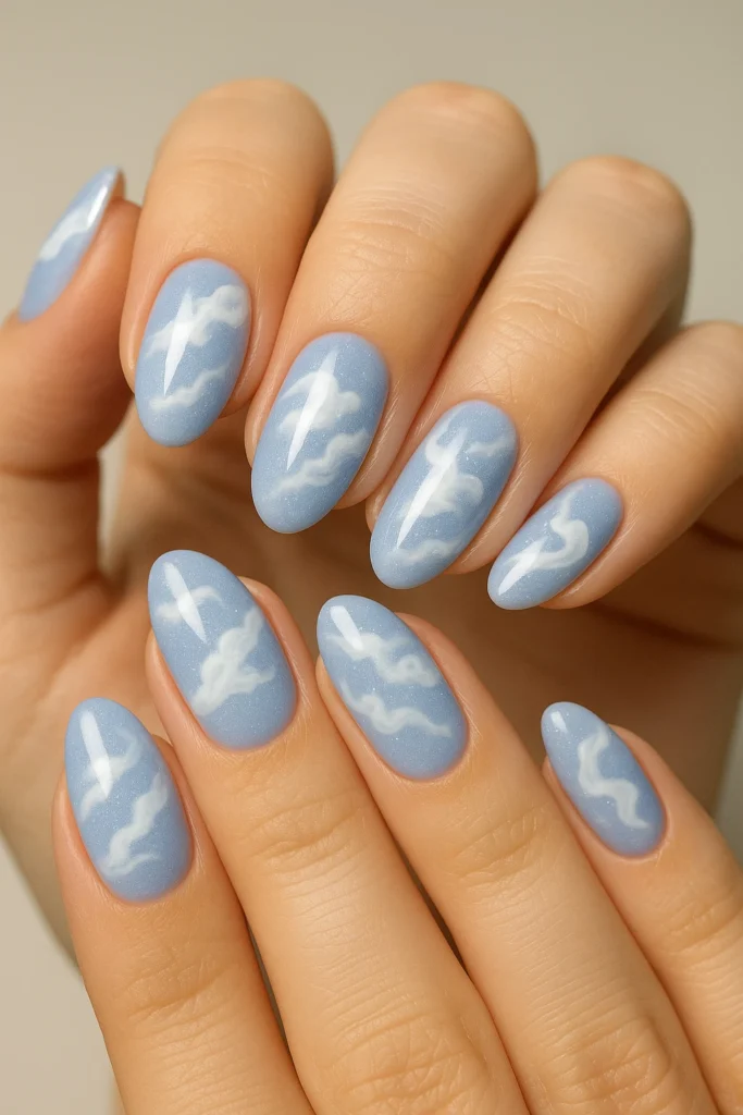 Soft blue nails with abstract cloud motifs create an ethereal, dreamy winter manicure. Subtle and elegant, perfect for year-round styling.