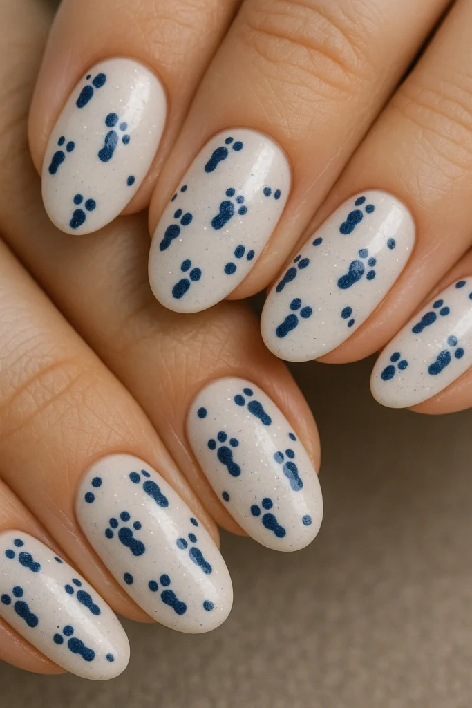 Soft white oval nails feature tiny dark blue abstract footprint motifs and gentle shimmer. Playful and modern, this winter-inspired design evokes movement and charm without being overly festive.