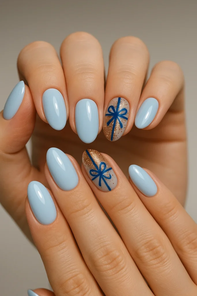 Pale blue nails with abstract gift-wrapping-inspired accents and bronze glitter create a chic, playful winter manicure. Ideal for parties or adding a stylish festive touch without being overly thematic.