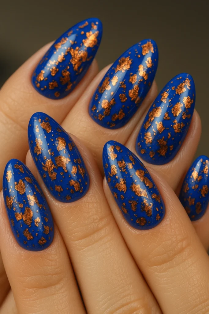 Royal blue nails accented with copper and bronze foil create a luxurious, warm winter manicure. The foil adds dimension and a festive hint without being overtly seasonal.