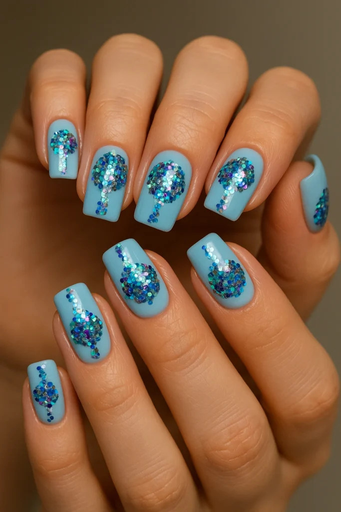 Light blue square nails with chunky glitter form abstract orb shapes, hinting at seasonal inspiration while remaining modern and wearable. Perfect for statement nails with festive sparkle that works year-round.