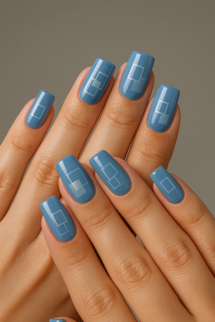 Medium blue square nails with geometric accents reminiscent of gift boxes offer a playful yet sophisticated manicure. Silver shimmer adds dimension and festive flair while keeping the design timeless and wearable year-round.