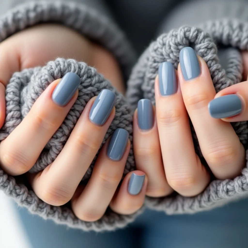 Muted blue-gray gel nails offer depth without boldness, making them ideal for winter. The tone balances cool color with neutral softness, creating a composed appearance. As a winter gel nail idea, this shade works well when applied evenly as a single color. The gel finish enhances polish and smoothness, preventing dullness. Blue-gray gel nails complement winter palettes naturally and provide subtle variation from standard neutrals while remaining seasonally appropriate.