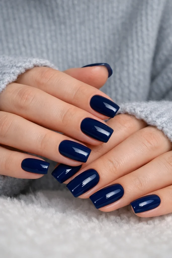 Navy gel nails provide depth while remaining softer than black. The muted blue tone aligns well with winter palettes and subdued lighting. As a winter gel nail idea, navy works best when applied evenly as a solid color. The gel finish enhances clarity and polish, preventing dullness. Navy gel nails complement winter clothing naturally, offering a composed and versatile manicure throughout the season.