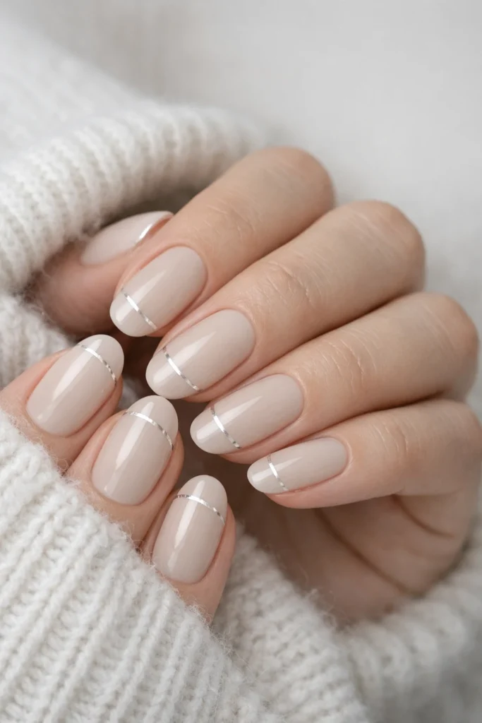 This winter gel nail idea introduces variation through a restrained line detail rather than bold design. The base color remains neutral, allowing the manicure to stay seasonally balanced. As a winter option, subtle detailing adds interest without overpowering the overall look. The gel finish ensures precision and smoothness, maintaining refinement. This style suits winter wear by combining simplicity with quiet structure, making it a versatile choice throughout the colder months.